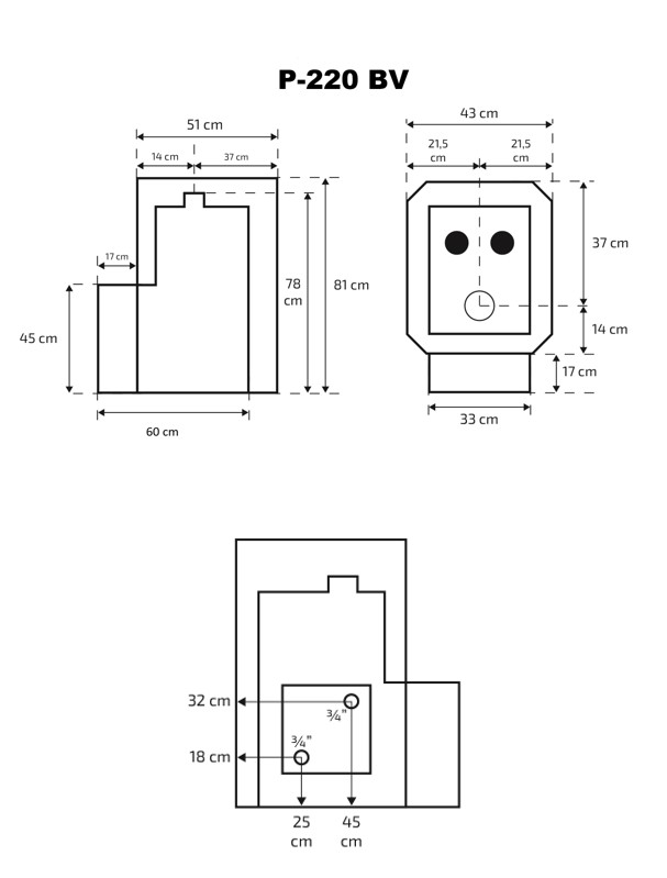 Skamet P-220 BV is a wood-burning sauna stove engineered for sauna rooms with a volume of 16–25 m³, where the firebox is located outside the steam room. This model features a left-side boiler connection, enabling easy integration with hot water systems — ideal for those who want both powerful sauna heat and expanded utility from one unit. Perfect for larger home and cottage saunas, this stove combines practical engineering, reliable performance, and traditional Nordic sauna craftsmanship.